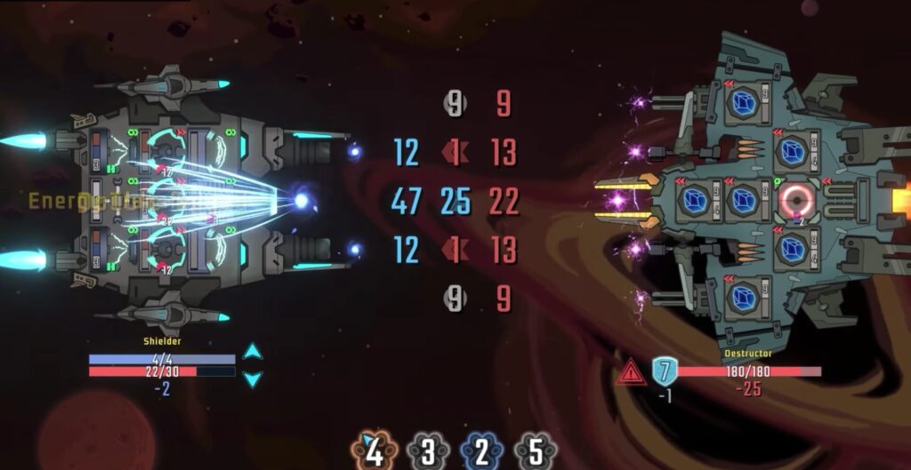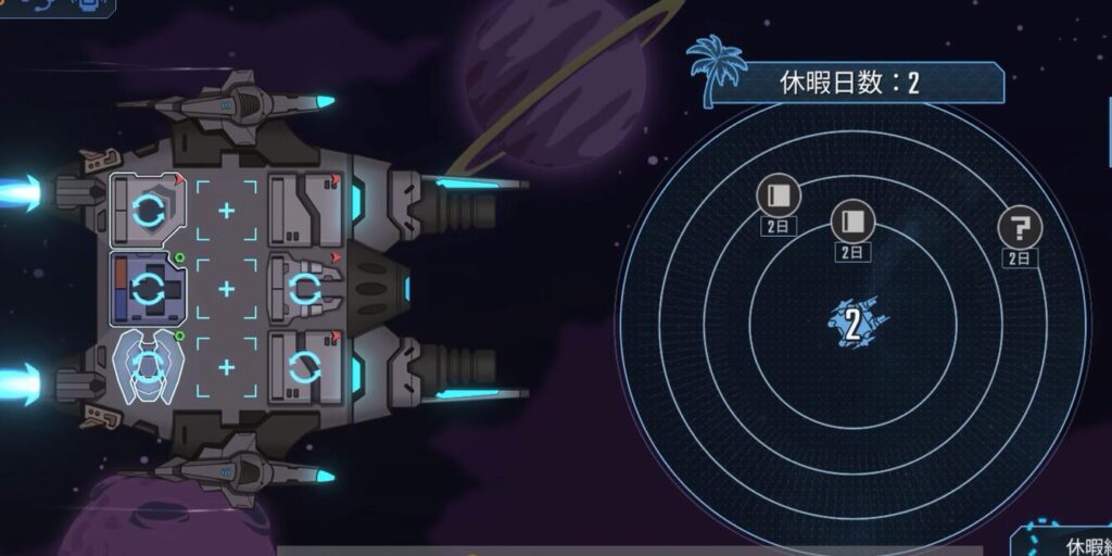 独特の戦闘システムとは。要は3×3マスのペイロードにパーツを配置し、砲台の出力を比較しあってダメージ計算をするシステムである。上の画像で言えば上で1被ダメージ、中央で25与ダメージ、下が1被ダメージで、この戦闘では敵に25ダメージを与えて、こちらは2ダメージを受けることになる。
