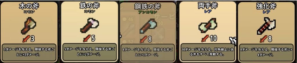 例えば、スロットっぽさがよく出るのは斧デッキだ。斧は相互に影響しあって火力を高める。代表的な斧アイテムの能力は以下の通り。